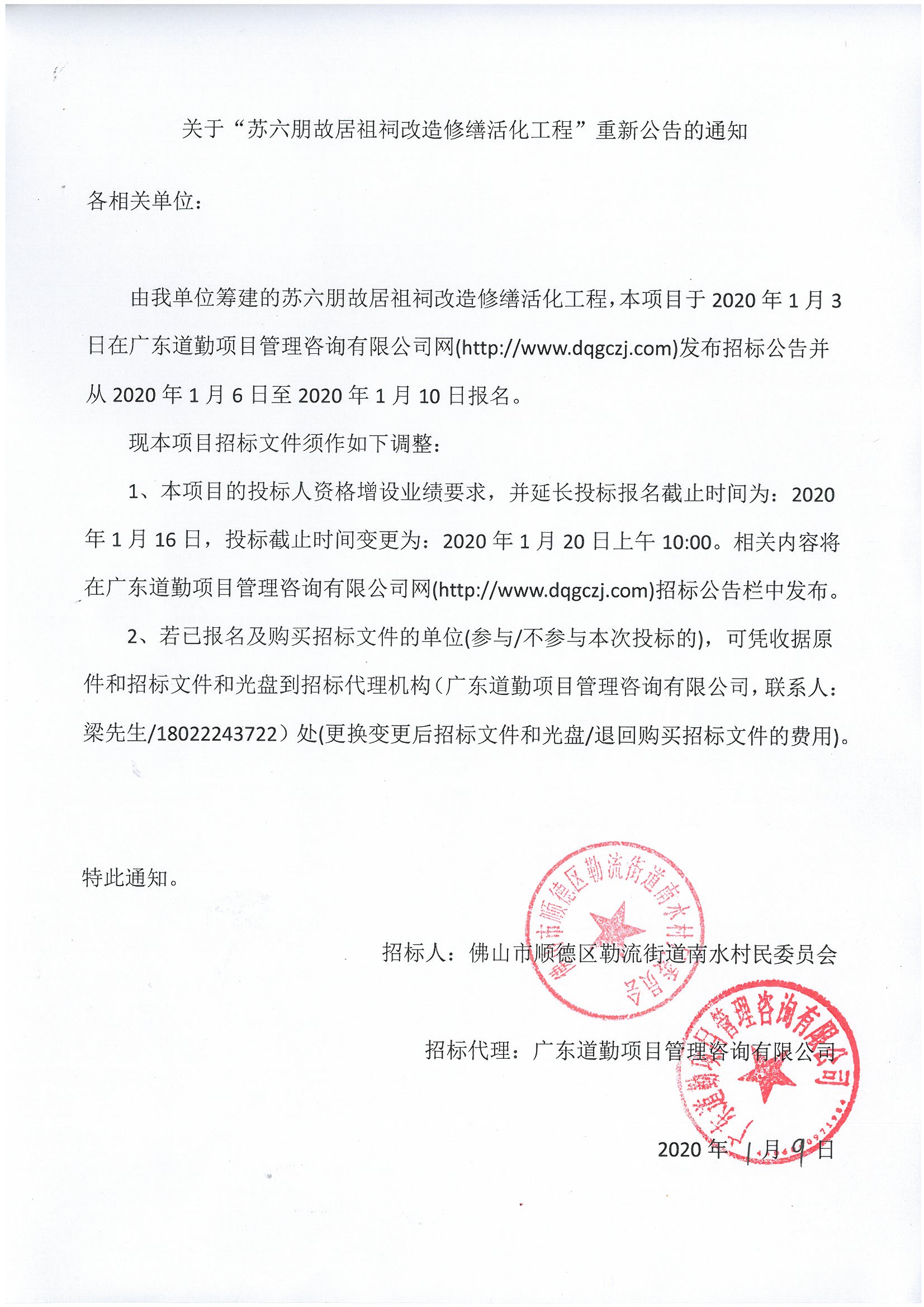 关于“苏六朋故居祖祠改造修缮活化工程”重新公告的通知