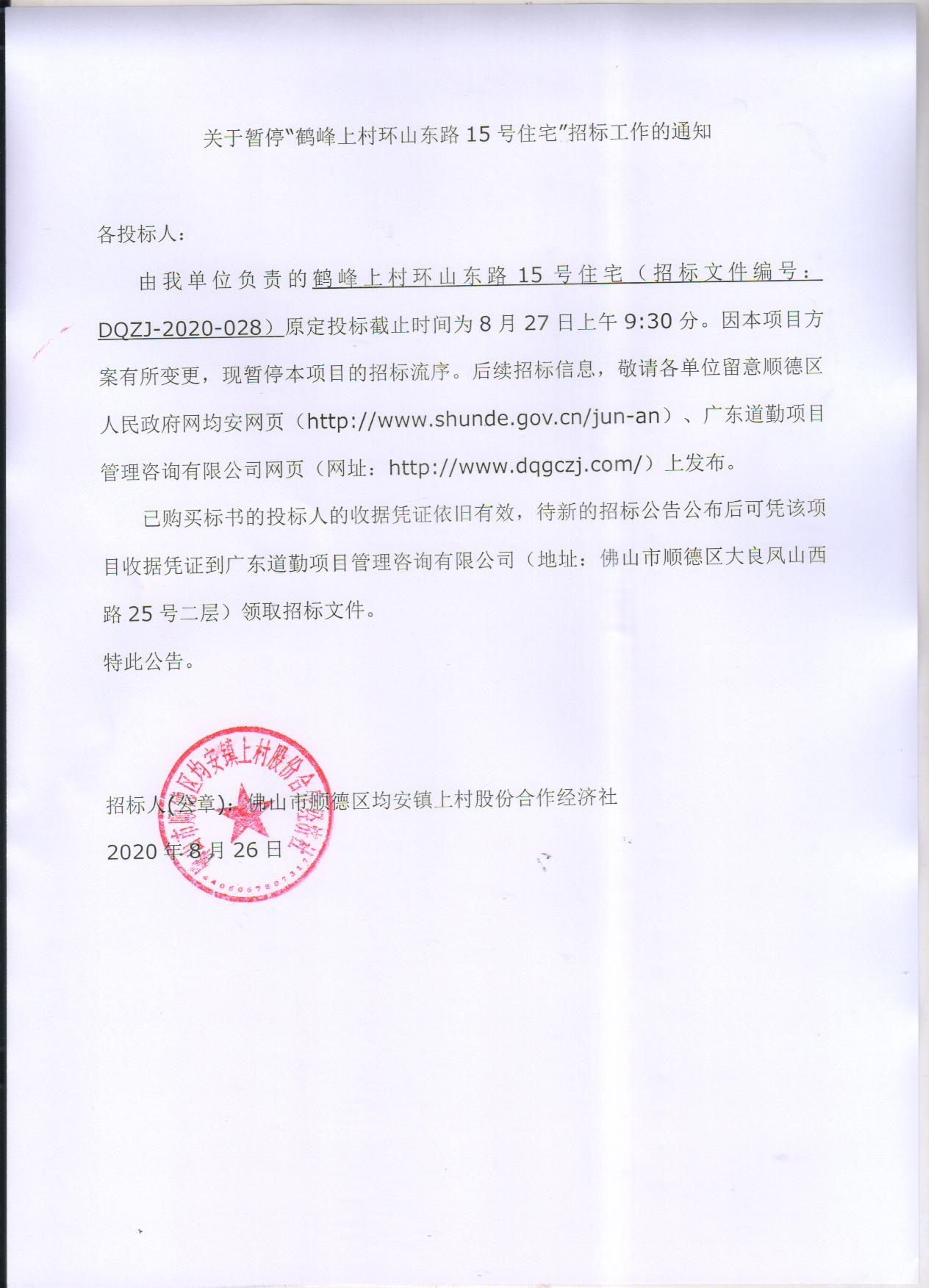 由我单位负责的鹤峰上村环山东路15号住宅(招标文件编号:DQZJ-2020-028)原定投标截止时间为8月27日上午9:30分。因本项目方案有所变更,现暂停本项目的招标流序。后续招标信息,敬请各单位留意顺德区人民政府网均安网页(http://www.shunde.gov.cn/jun-an)、广东道勤项目管理咨询有限公司网页(网址:http://www.dqgczj.com/)上发布。