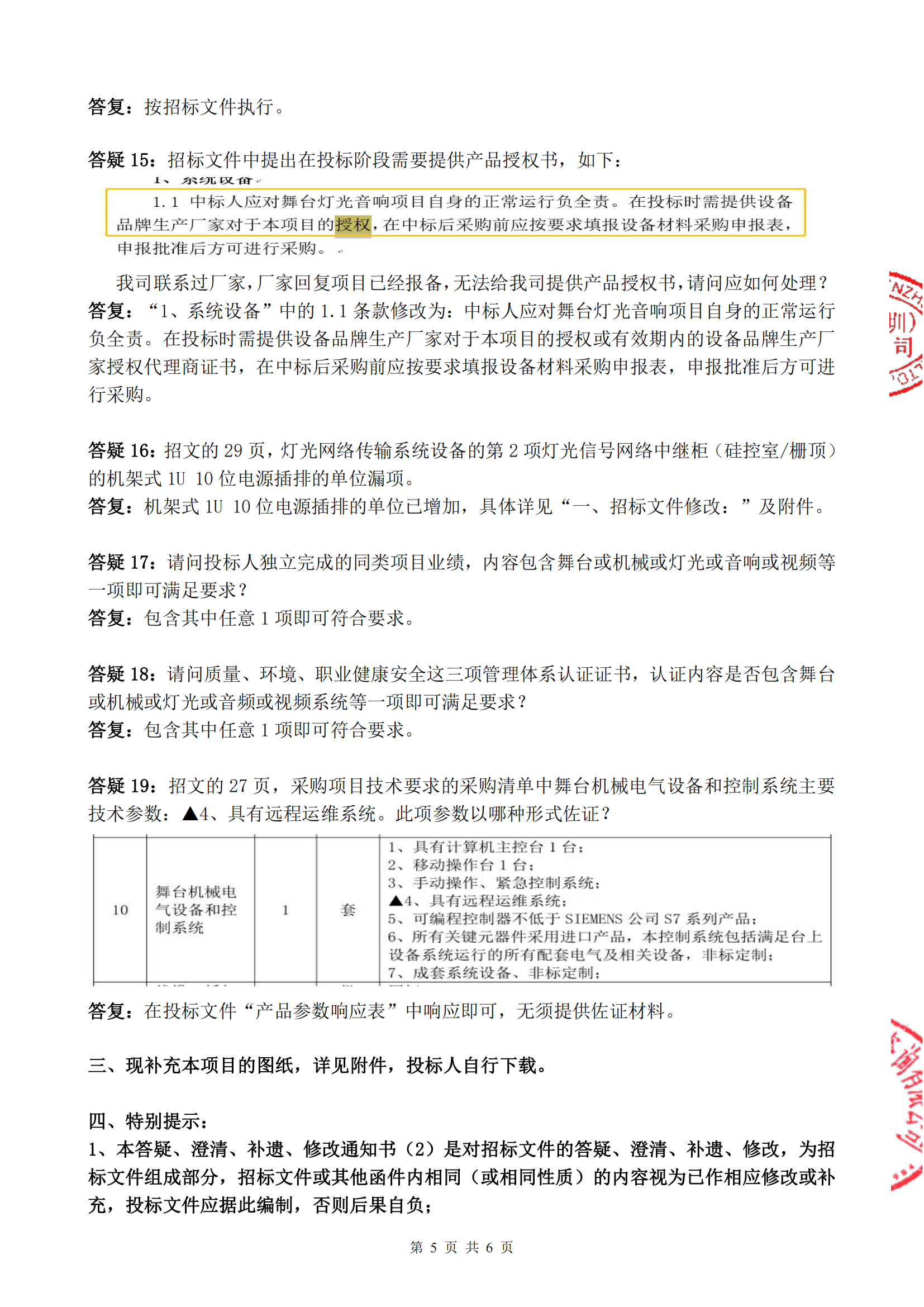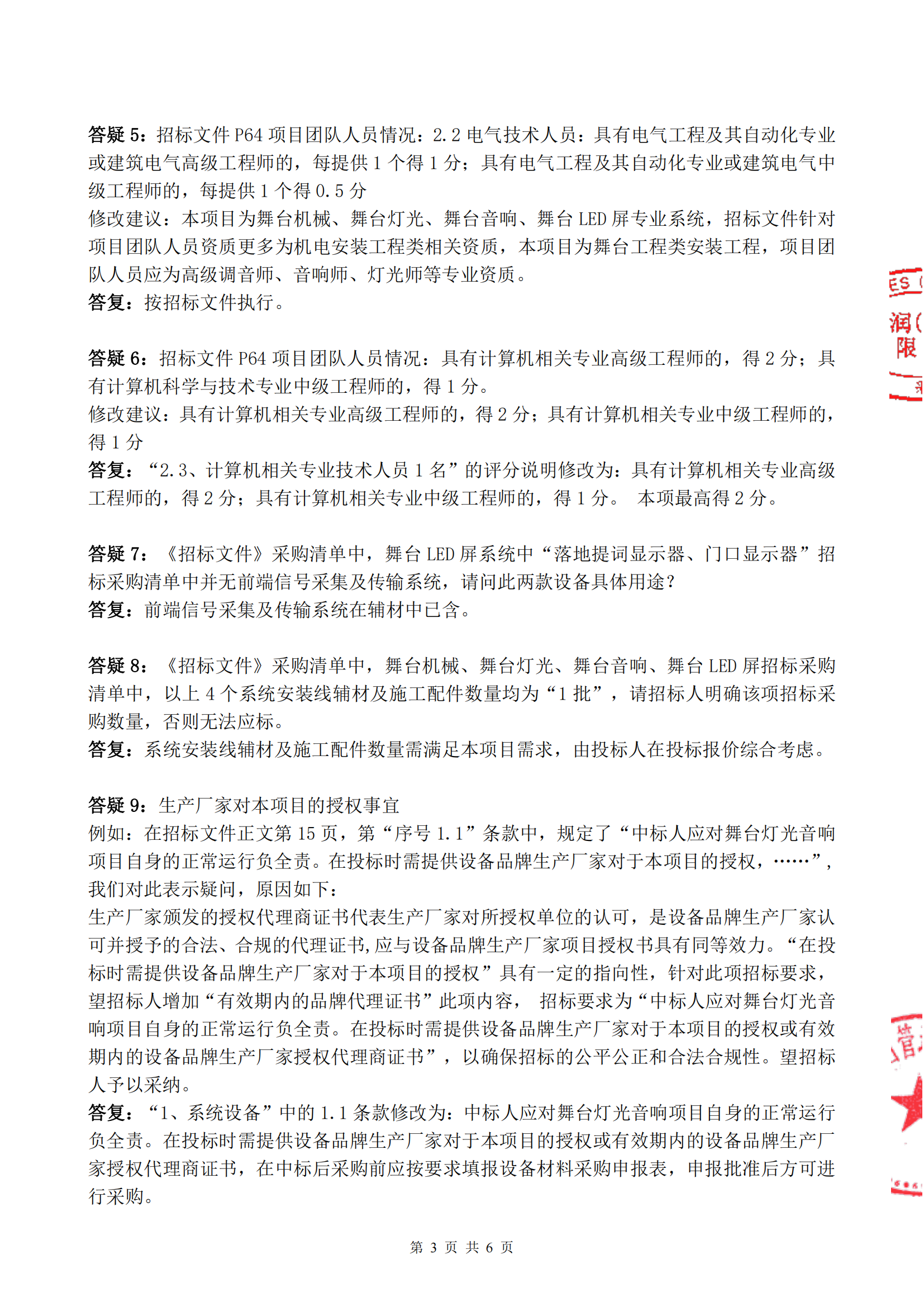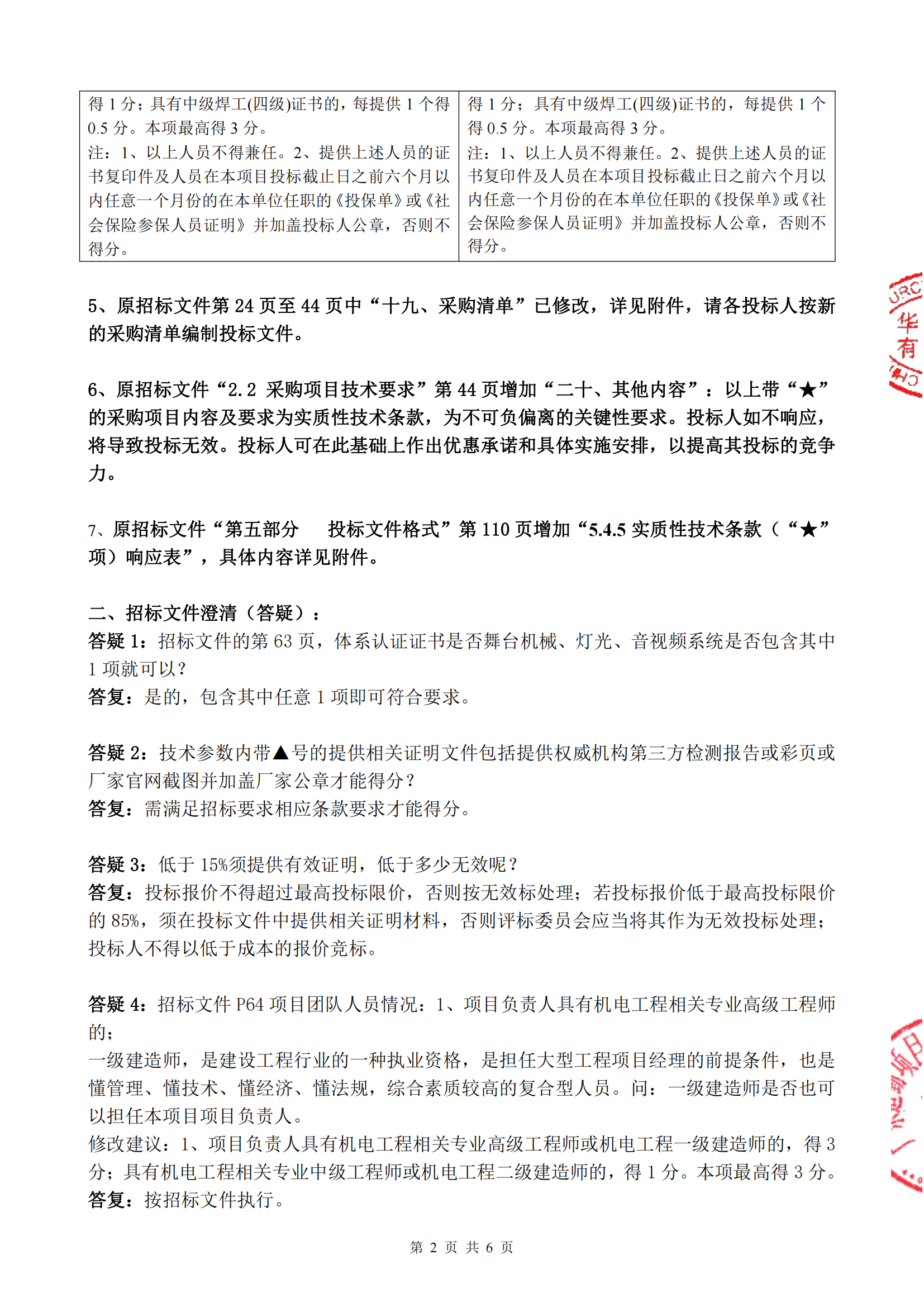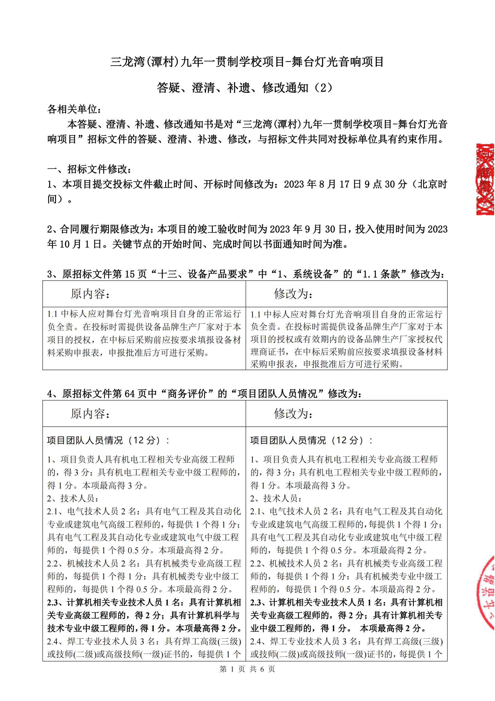 三龙湾(潭村)九年一贯制学校项目-舞台灯光音响项目答疑、澄清、补遗、修改通知(2)